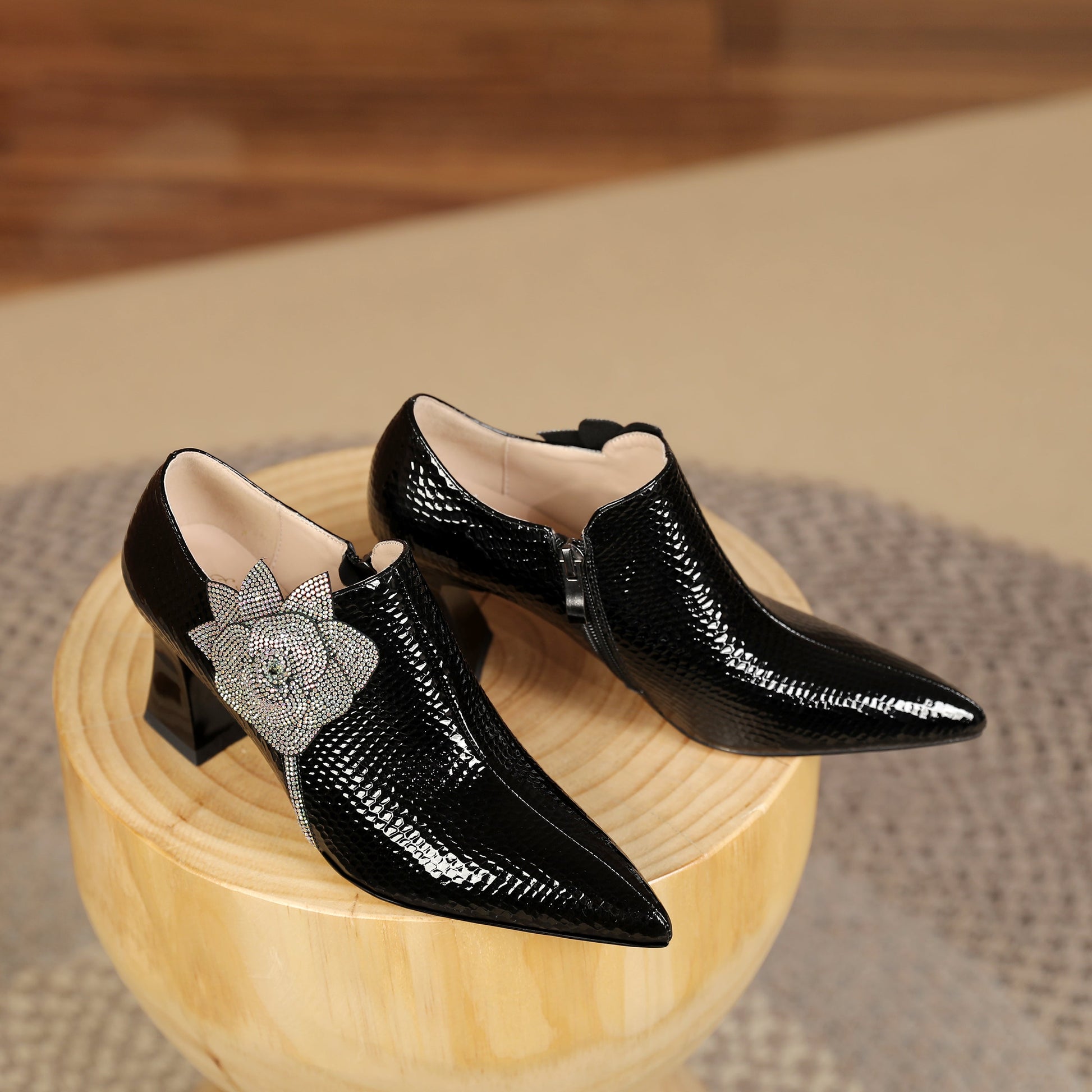 Patent leather pumps shoes designed with pointed toe, side zipper, flower décor and chunky heels to keep up with fashion trend.