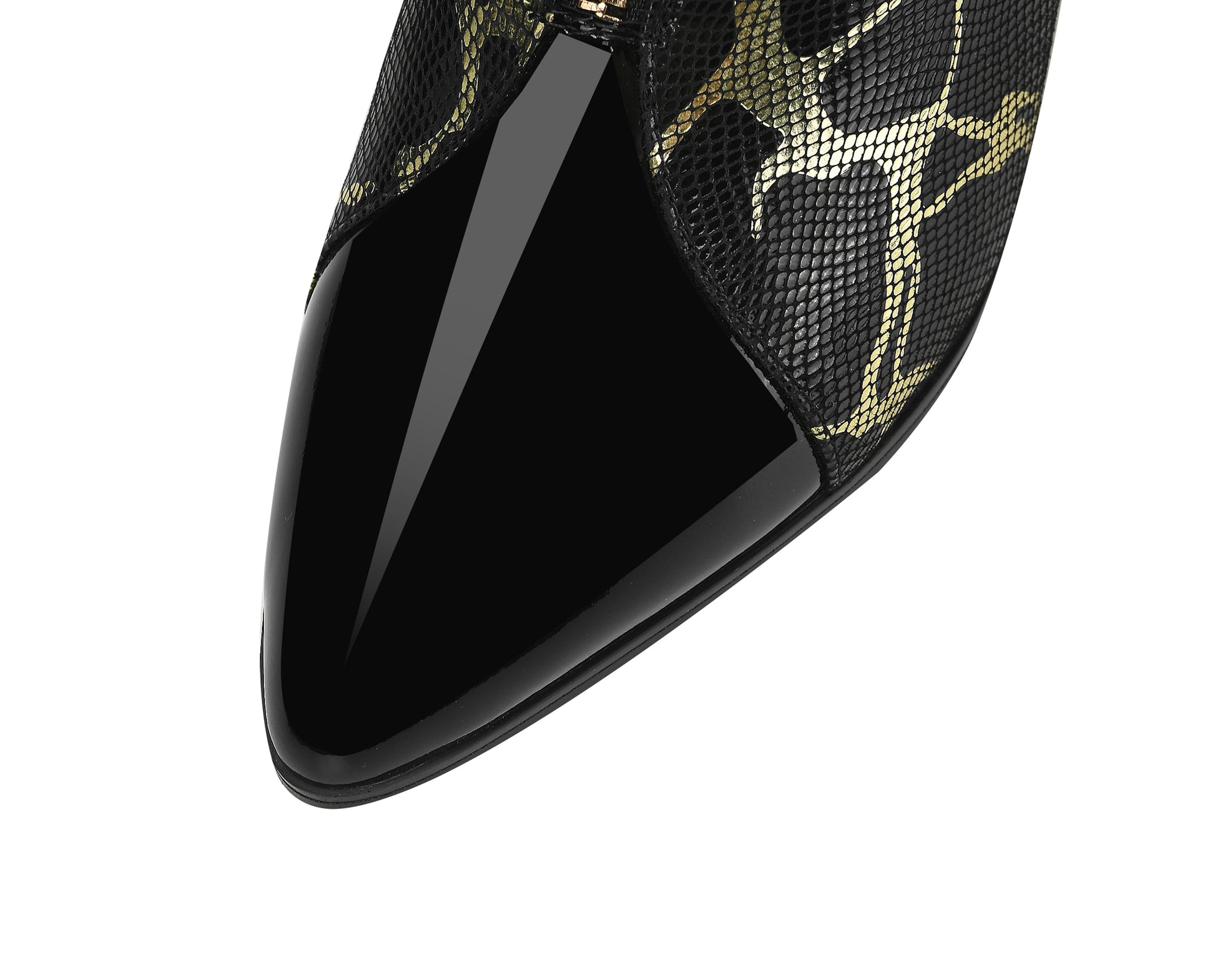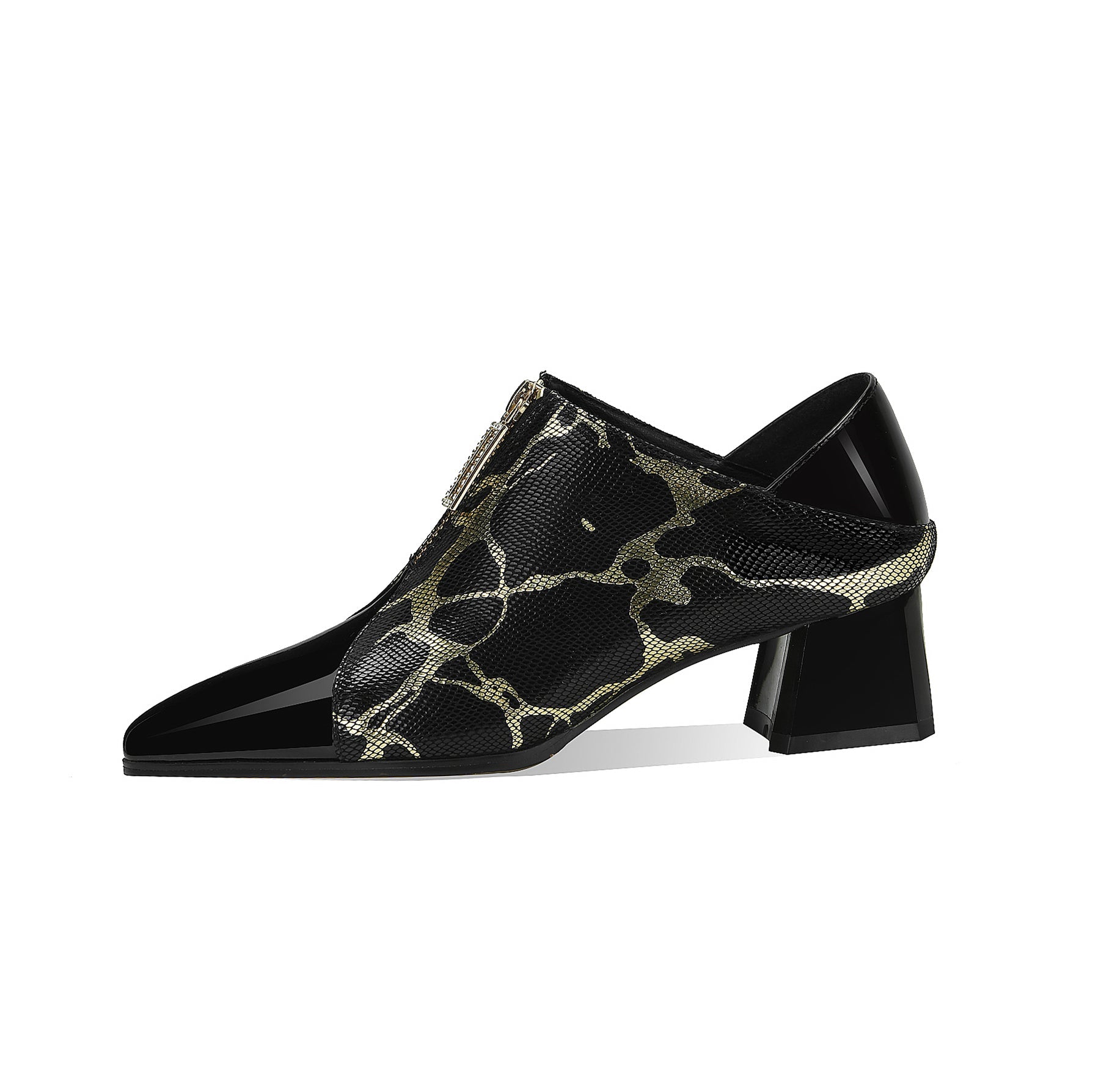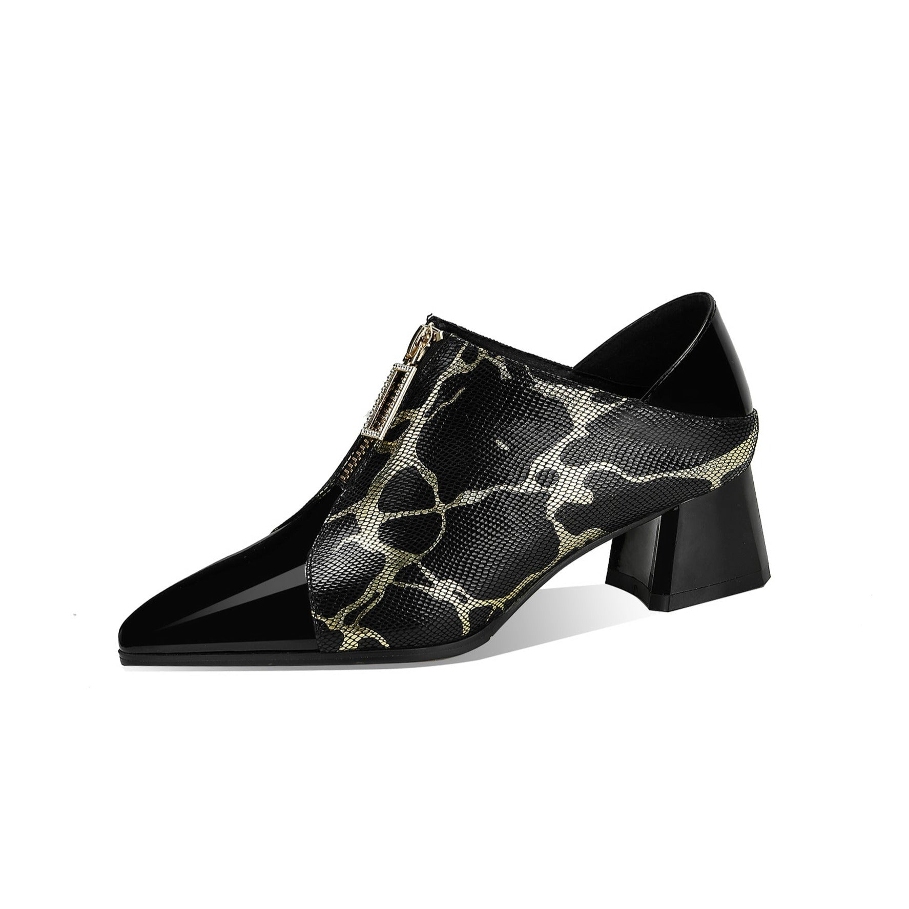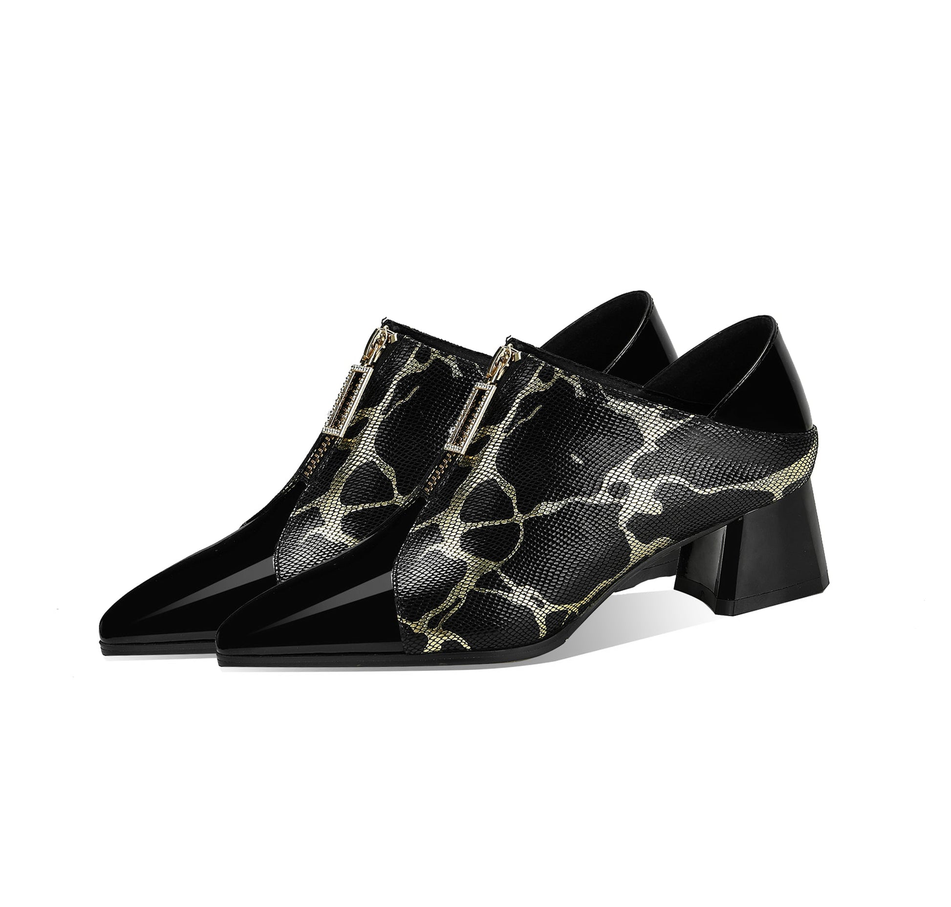 Genuine leather pumps shoes designed with pointed toe, front zipper and chunky heels to keep up with fashuon trend.