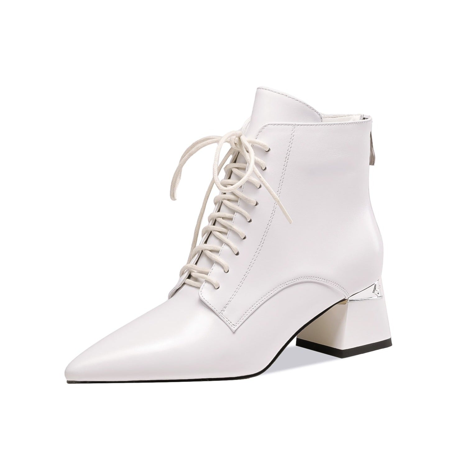 Genuine leather ankle boots designed with pointed toe, lace up, low chunky heels and back zipper can make you feel comfortable with every steps.