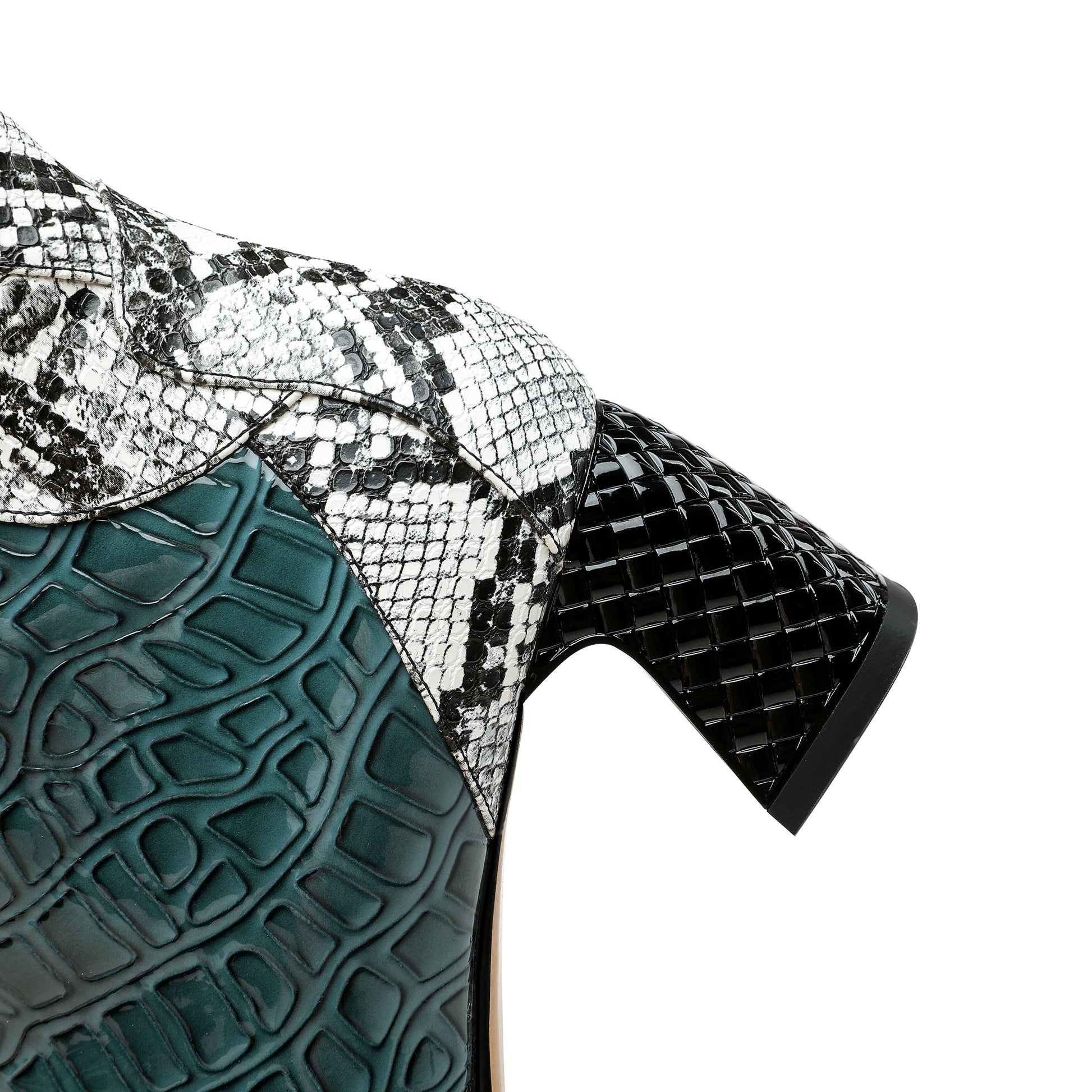 Nine Seven Handmade Women's Patent Leather Patchwork Color Snakeskin Pointed Toe Side Zipper Mid Block Heel Ankle Boots Shoes