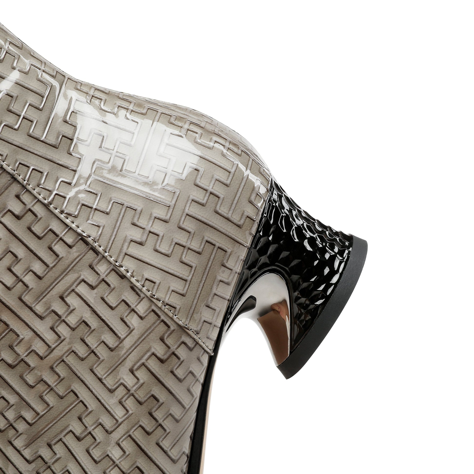 Glossy patent leather ankle boots designed with pointed toe, side zipper and low chunky heels can make you feel comfortable with every steps.