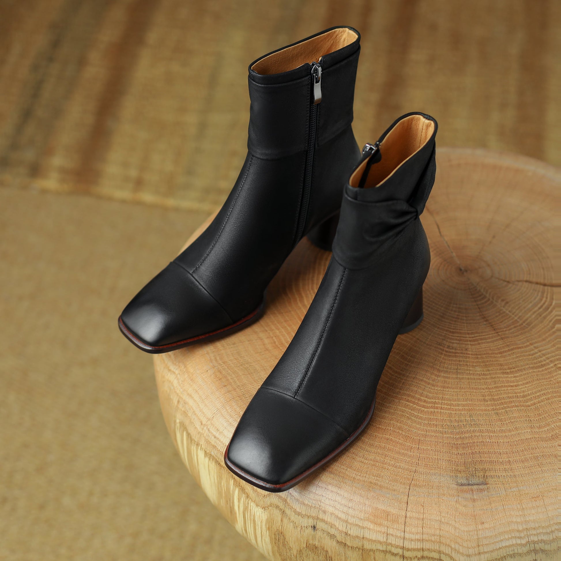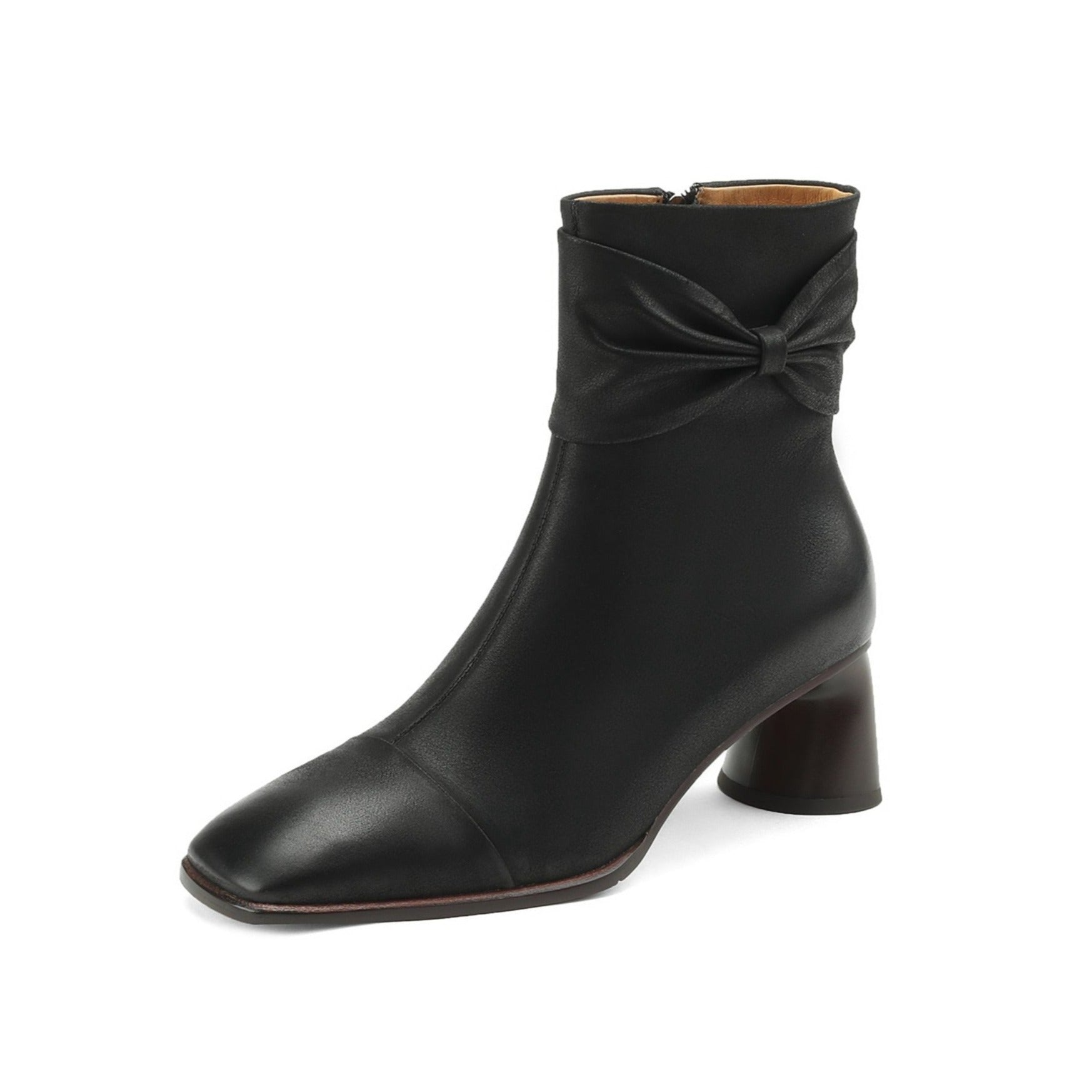 Nine Seven Handmade Women's Genuine Leather Bowknot Décor Side Zipper Square Toe Mid Chunky Heel Ankle Boots Shoes