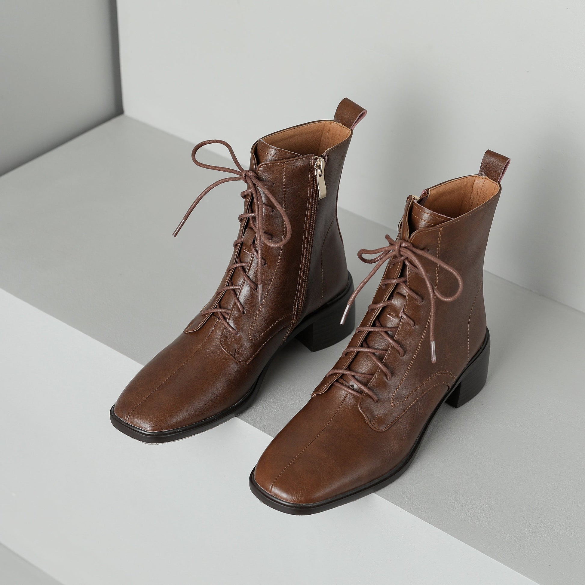 Cool ankle boots designed with genuine leather, square toe, lace up, side zipper and low chunky heels can make you feel comfortable with every steps.