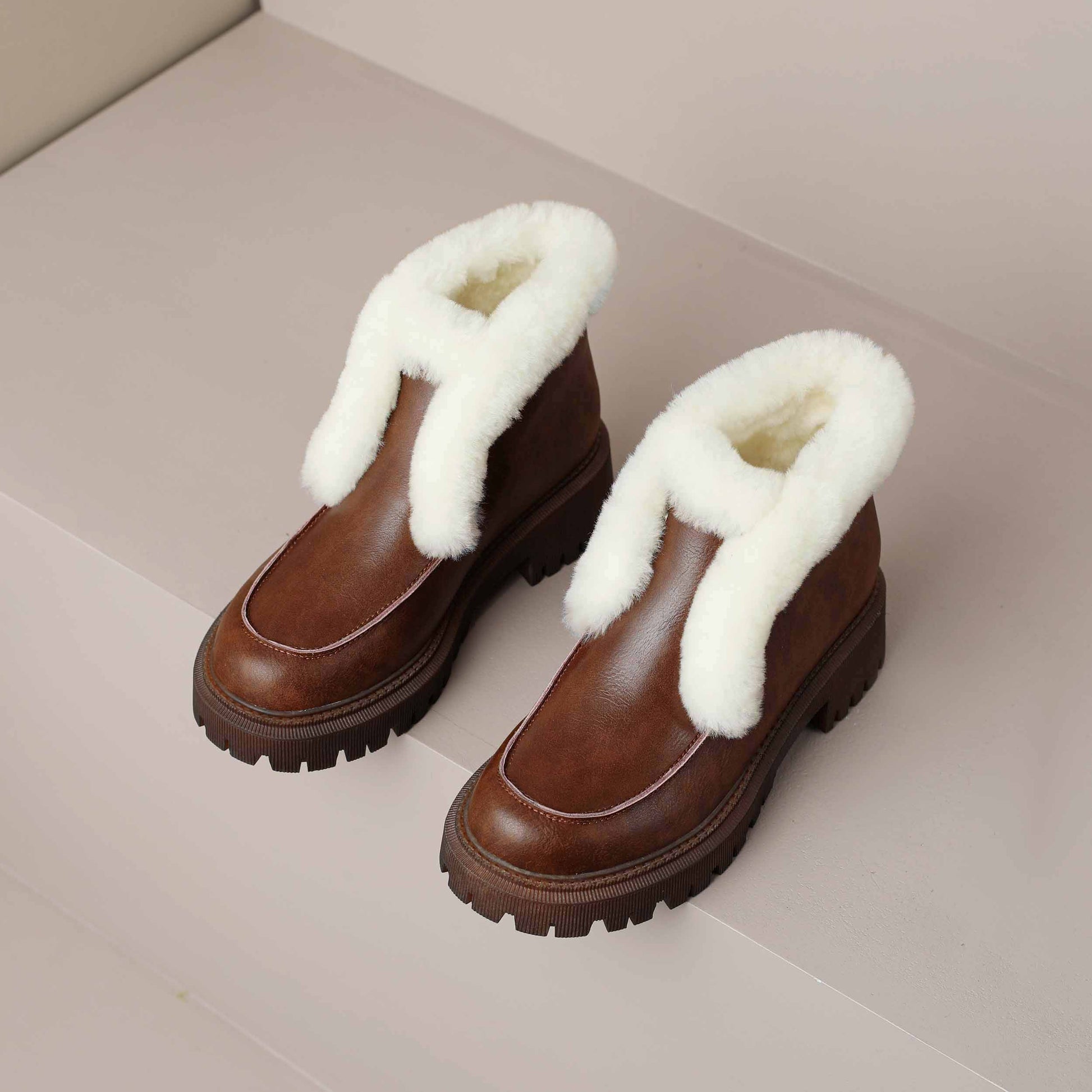 Nine Seven Handmade Women's Genuine Leather Furry Pull On Round Toe Low Block Heel Platform Ankle Boots