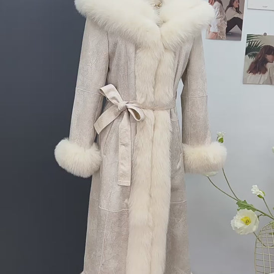Fox fur in collar and cuff (non-removable), rabbit hair and suede nap for the whole coat