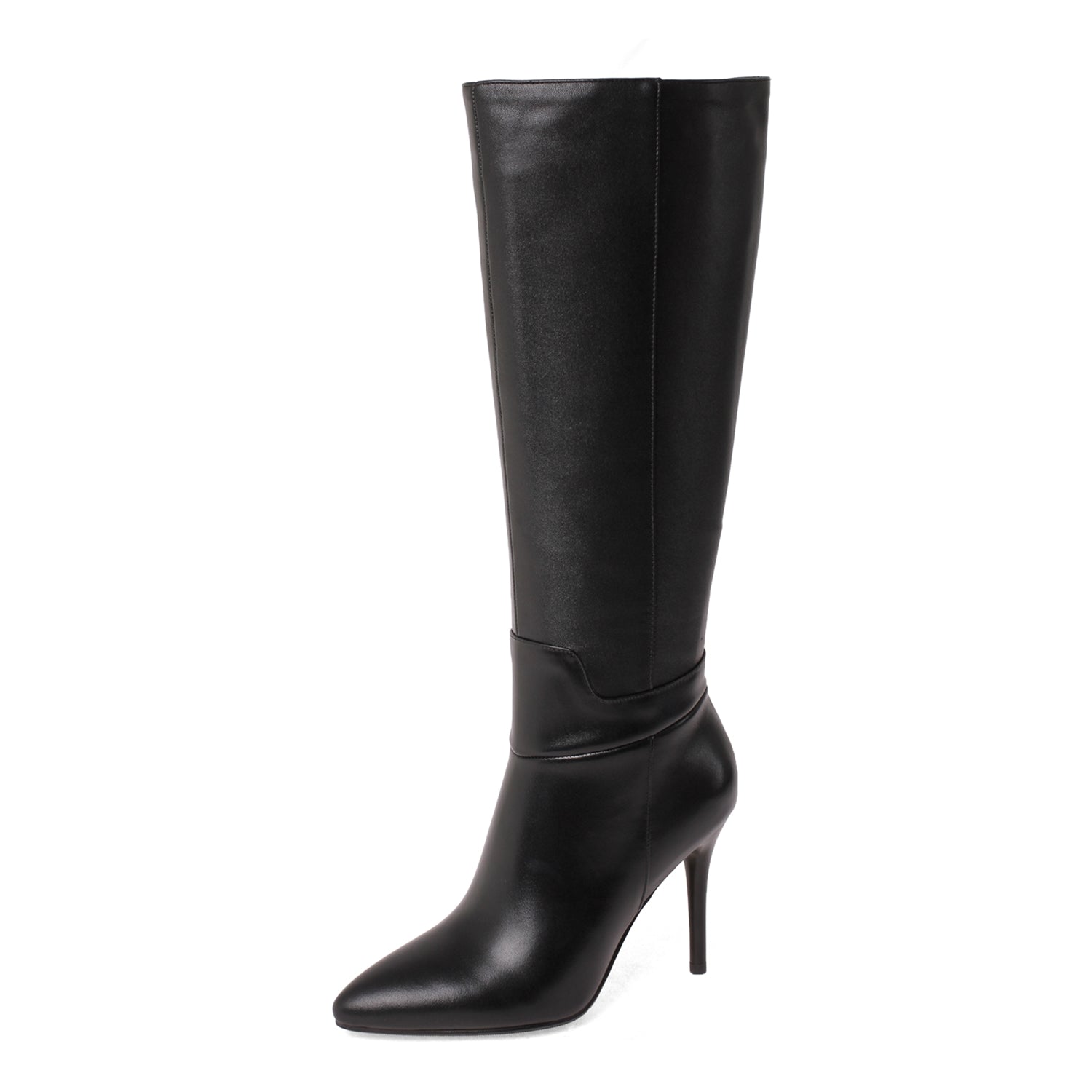 Sexy knee high boots designed with genuine leather, pointed toe, stiletto high heel and side zip to keep up with fashion trend.