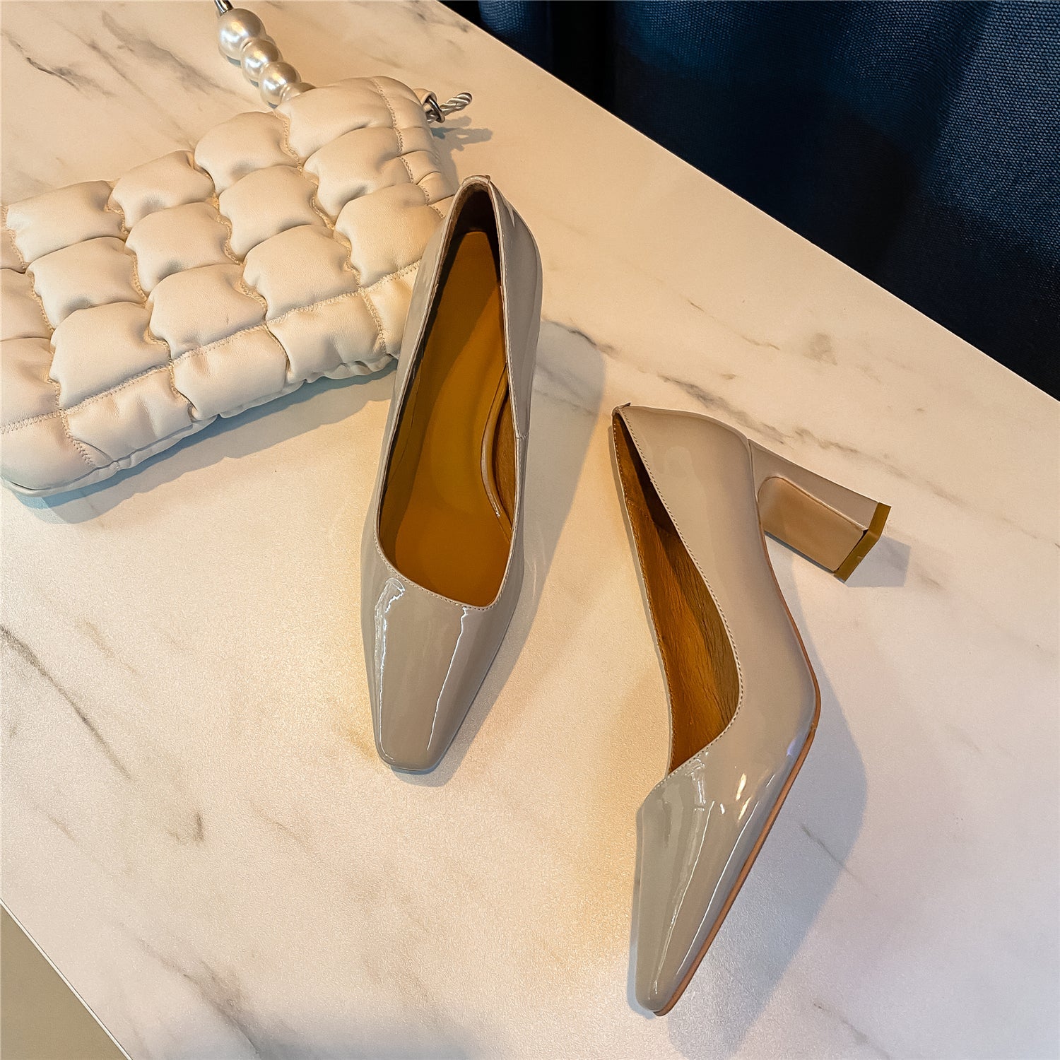 Glossy patent leather pumps shoes with square toe and chunky heels, more comfortable to wear.