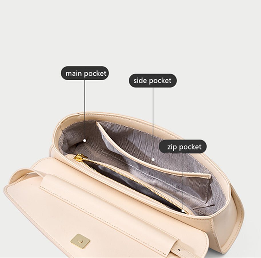 This bag can fit your phone, wallet, perfume, mask, make up, keys and a few other things. One side pocket inner for ID, cash. It sits nicely on every style. Stylish and fashion!!!