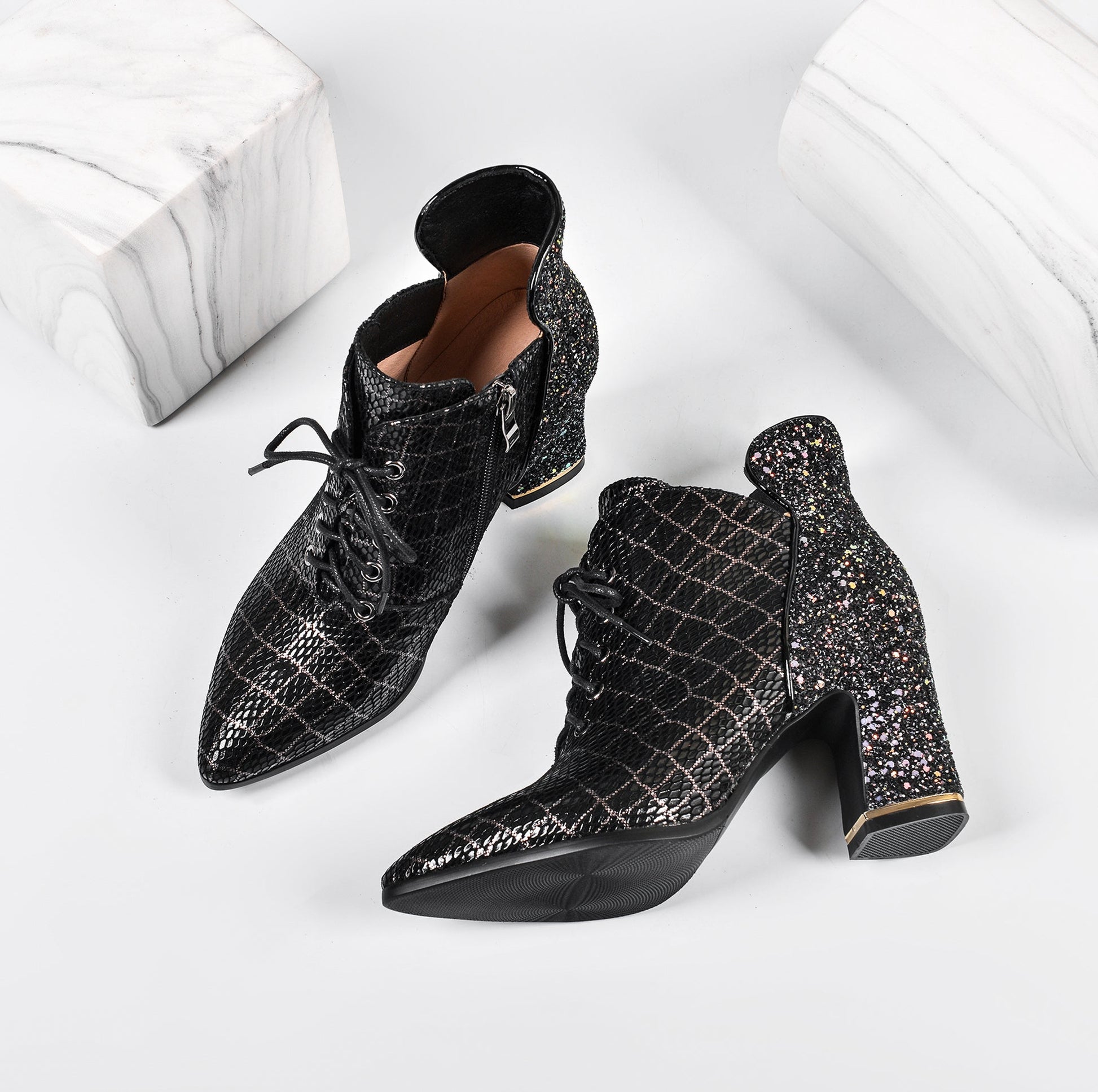 Nine Seven Genuine Leather Pointed Toe Handmade Lace Up Side Zipper Chunky Heels Stylish Booties