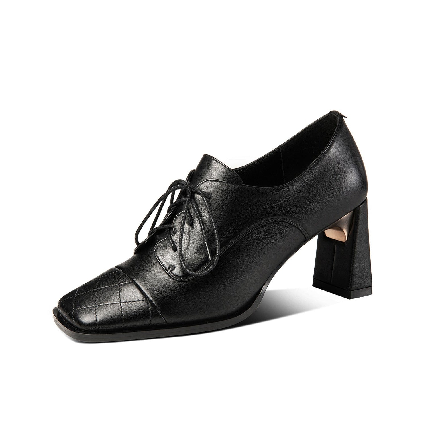 Nine Seven Genuine Leather Women's Handmade Classic Square Toe Chunky Heel Lace Up Oxford Pump Shoes