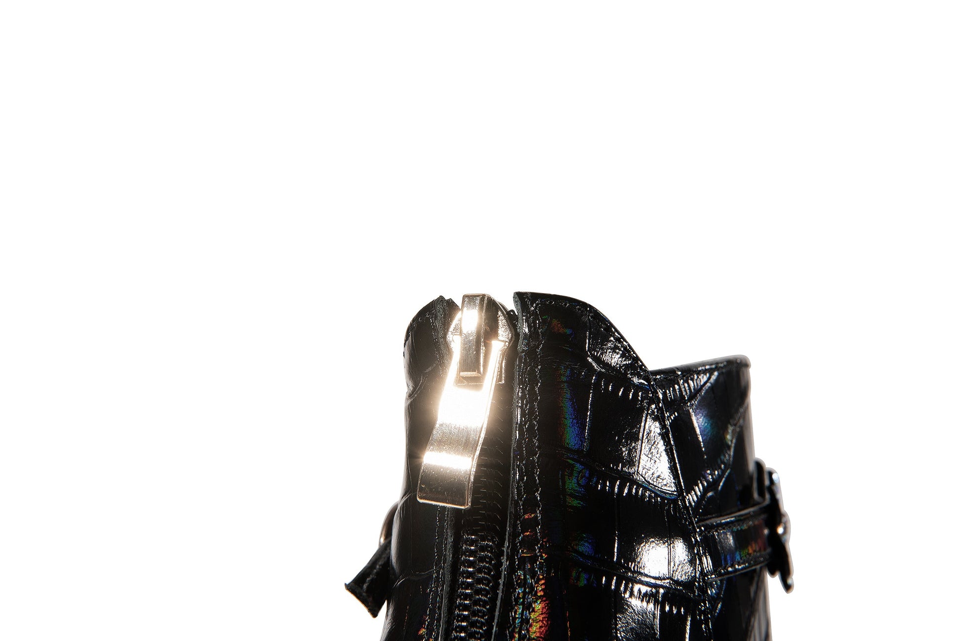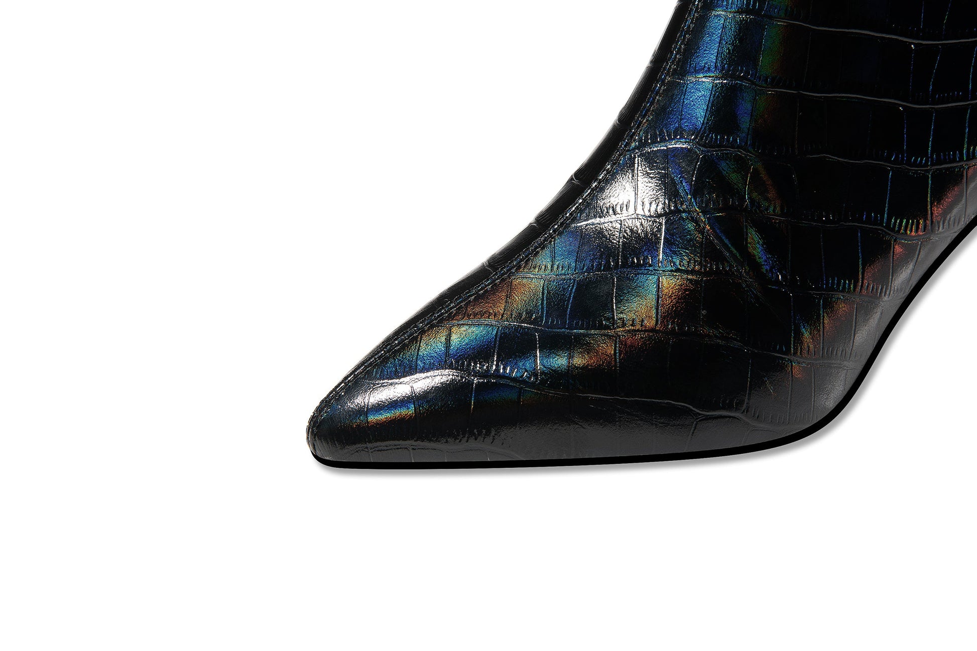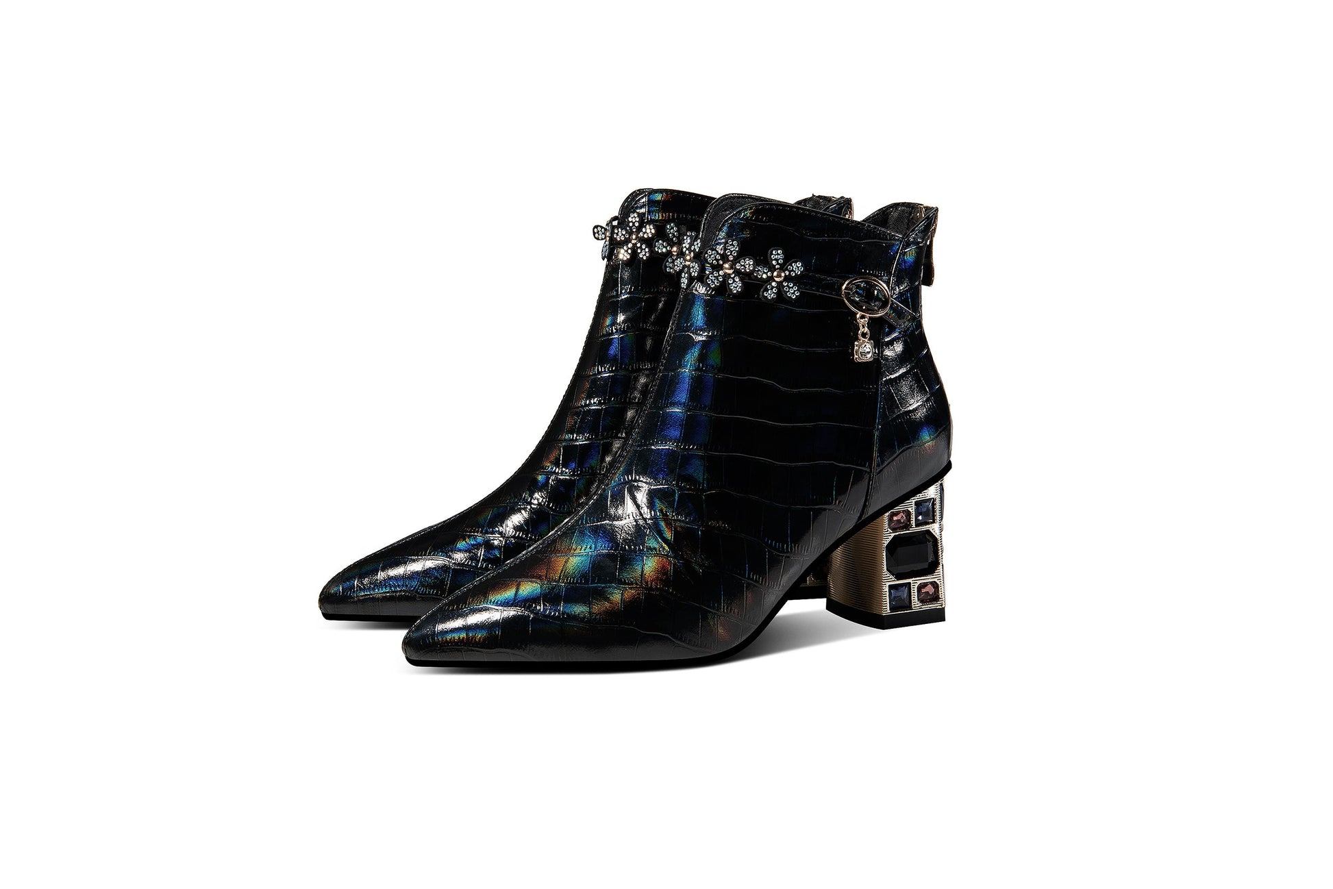 Leather dress boots are designed with pointed toe, crystal heel, zip and floral belt to keep up with fashion trend. These fashion booties go with different outfits.