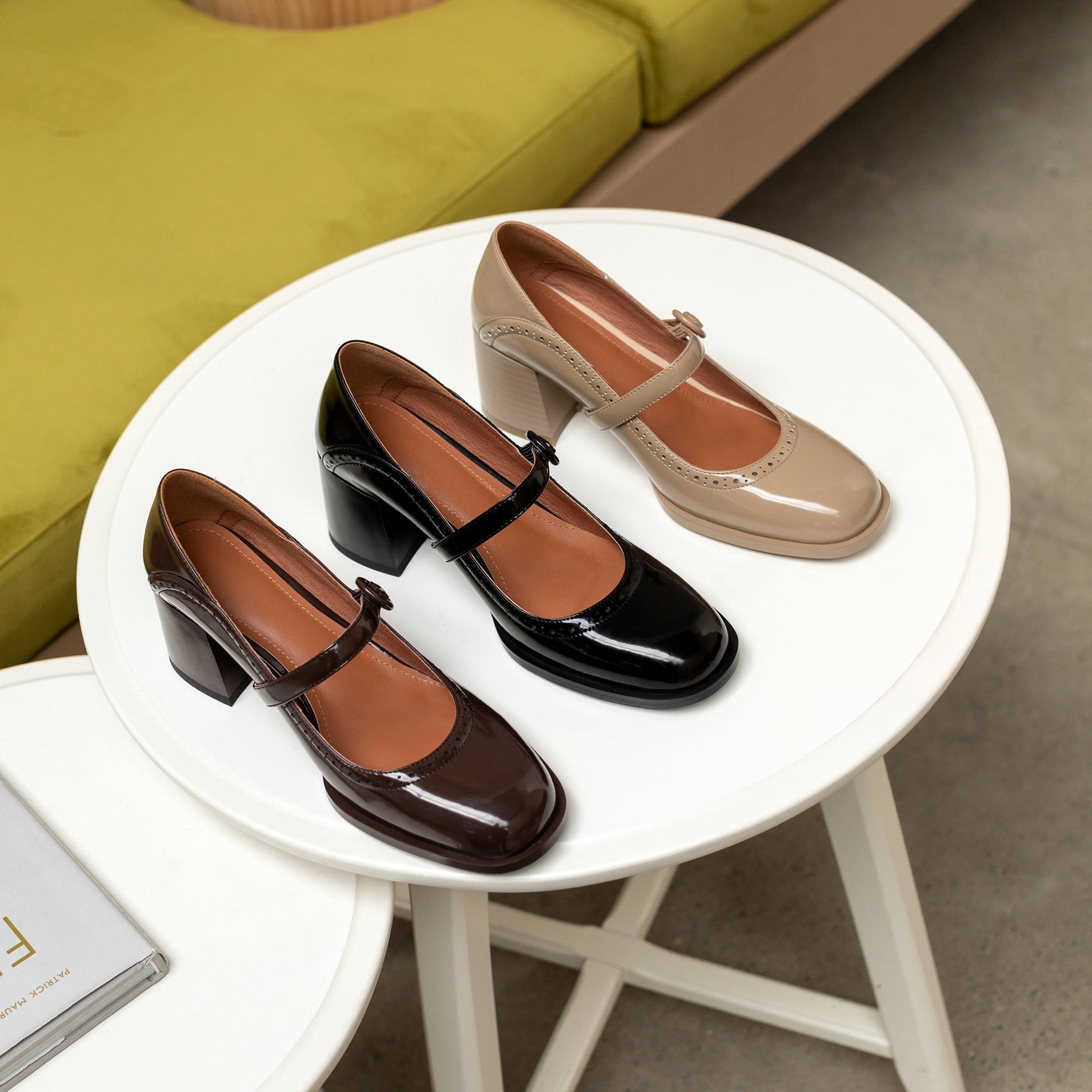 Nine Seven Glossy Genuine Leather Women's Handmade Round Toe Mid Block Heel Buckle Cute Mar Jane Pump Shoes