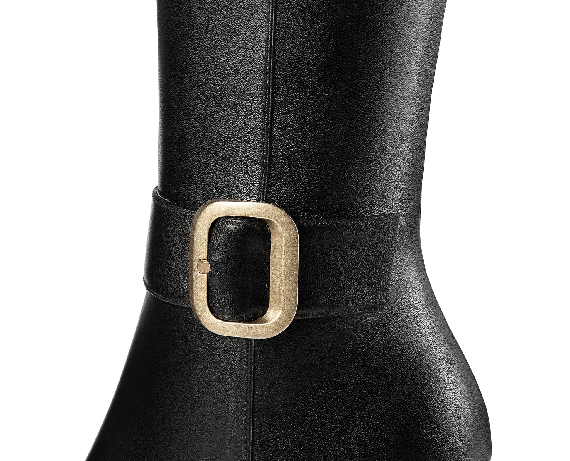 These knee high boots are designed with pointed toe, convenient side zipper,spool heel and chic buckle.