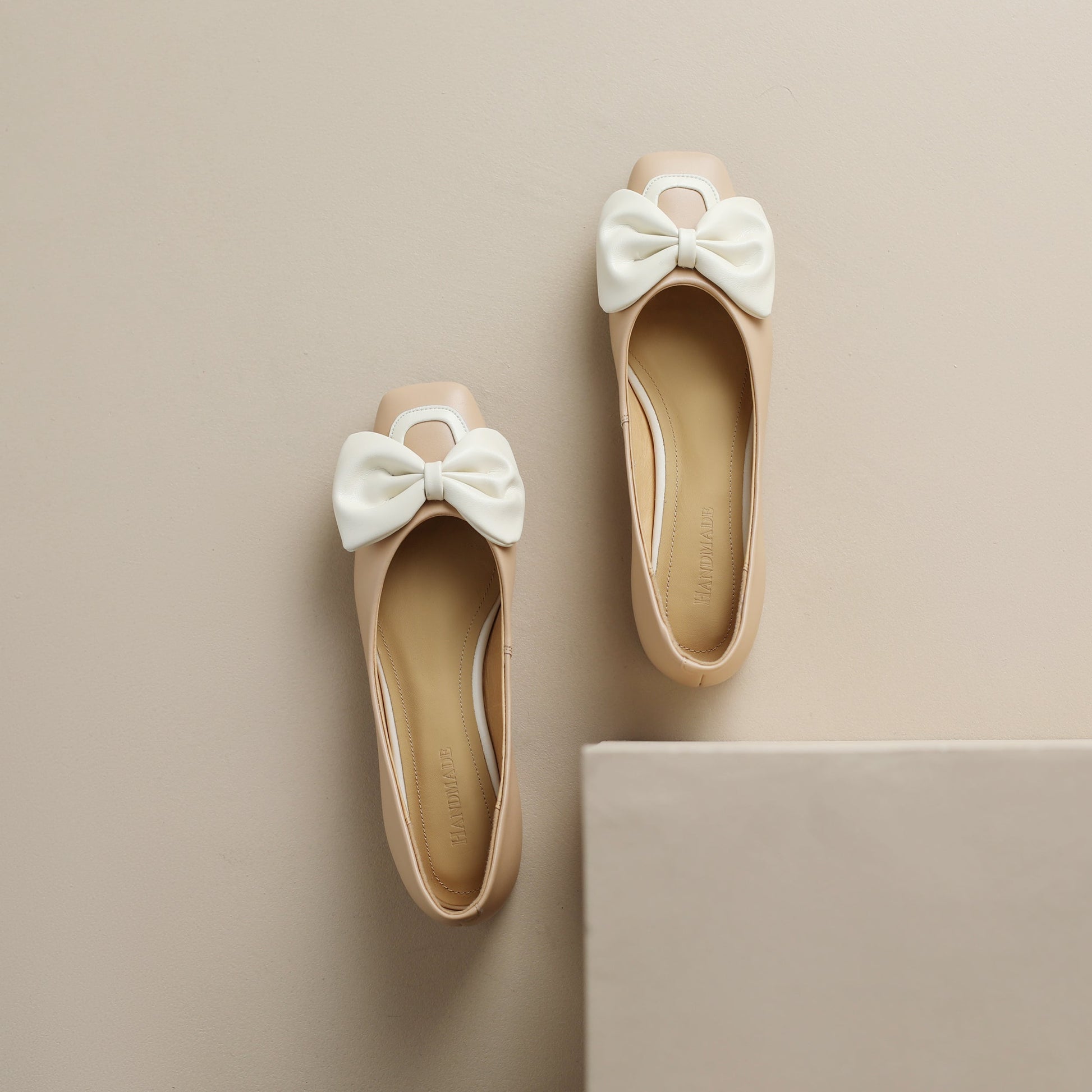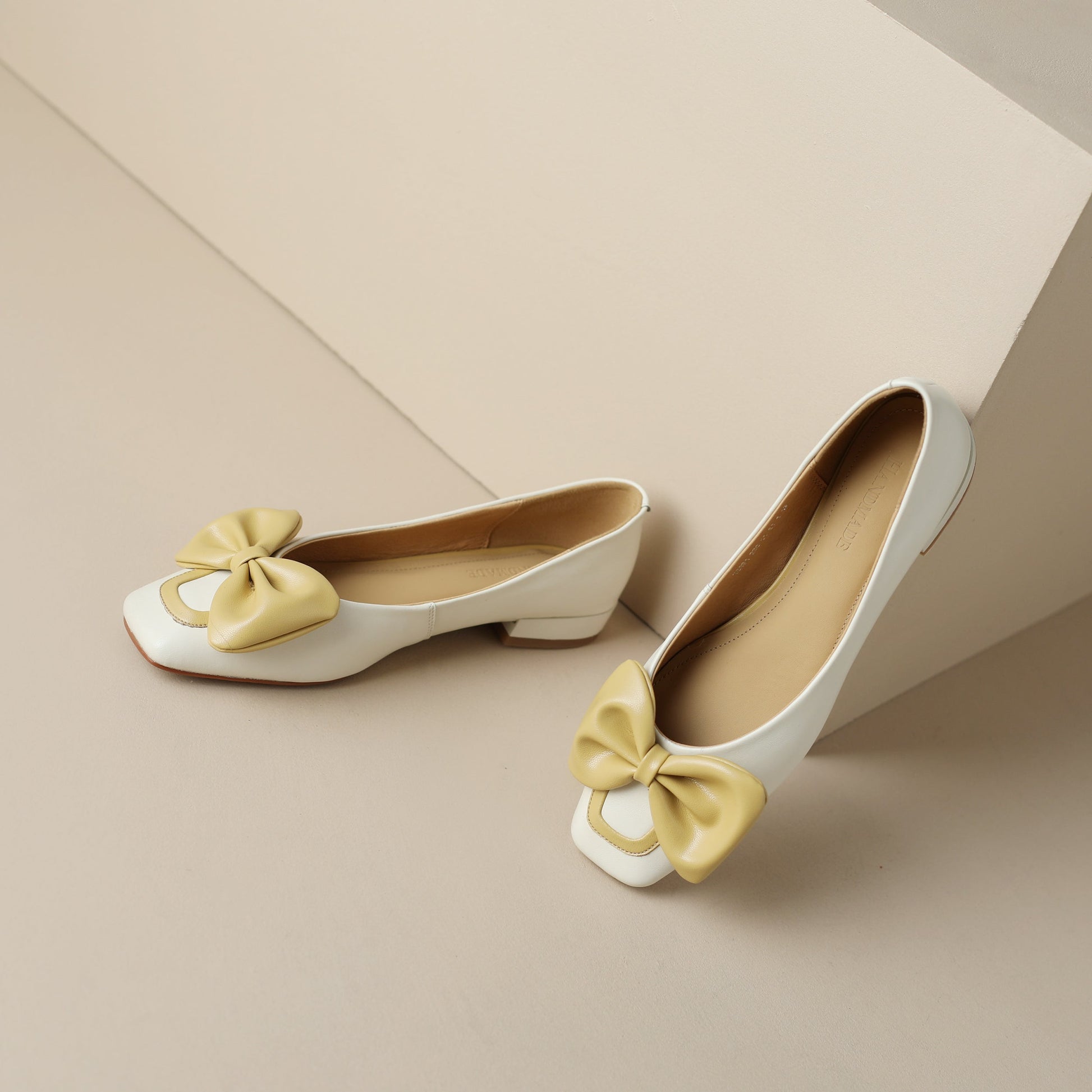 Nine Seven Women's Genuine Leather Square Toe Handmade Bowknot Chunky Heels Casual Flats