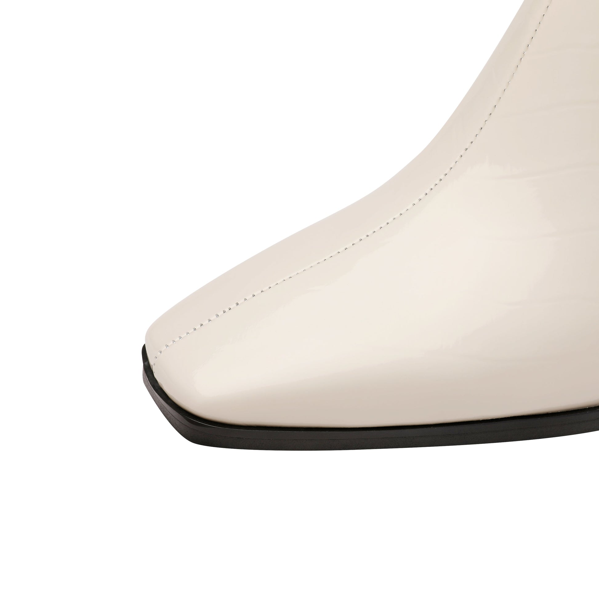 Stylish ankle boots are designed with patent leather, square toe, mid chunky heel, side zipper with exquisite buckle to keep up with fashion trend and give you visual enjoyment.