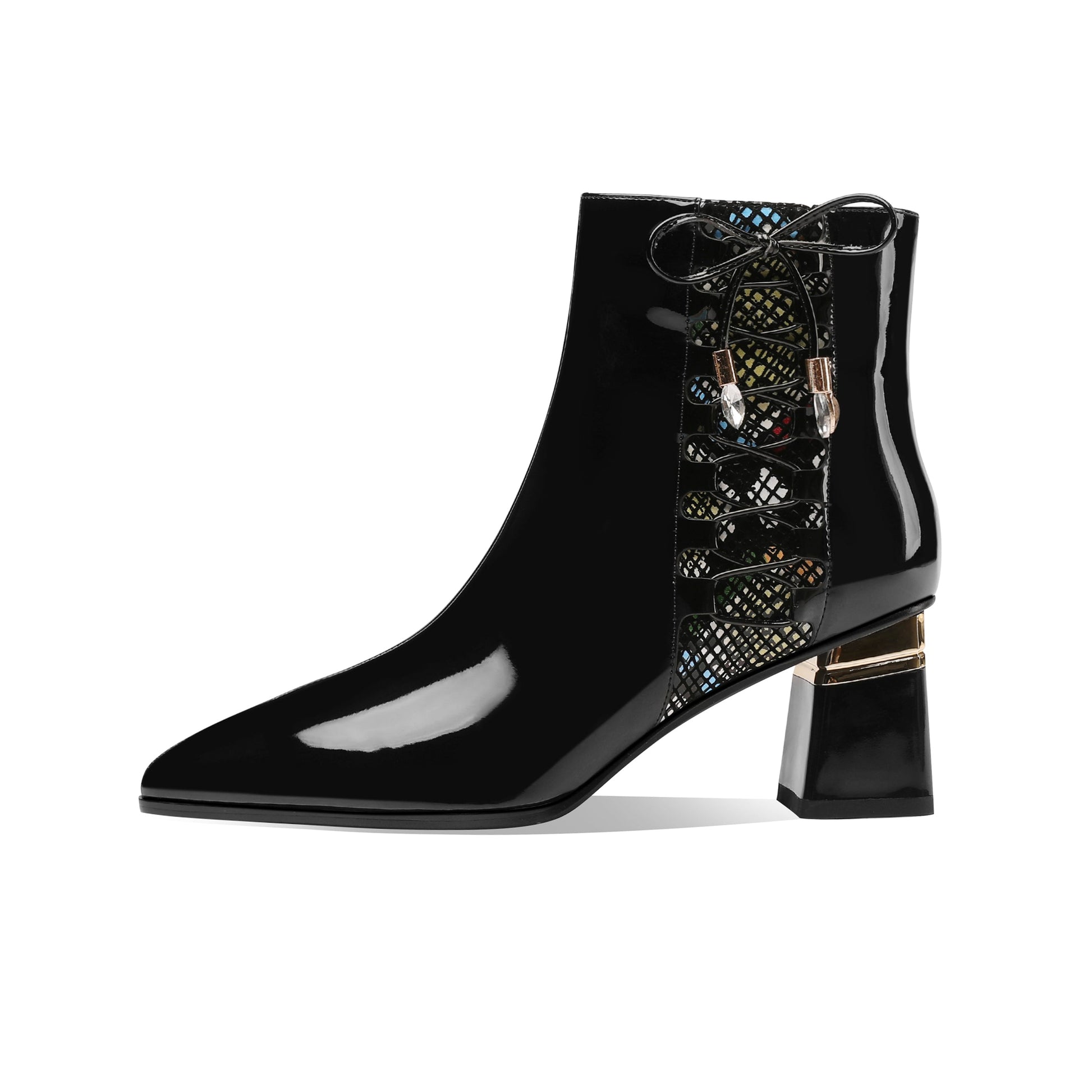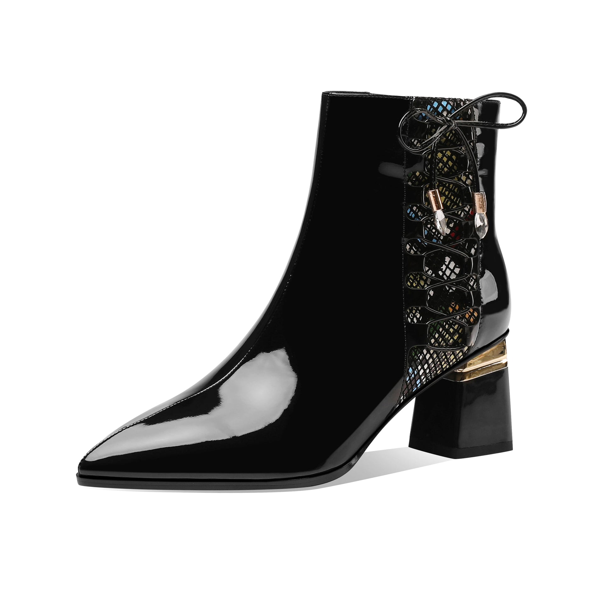 Stylish dressy boots designed with patent leather, pointed toe,chunky heel, side zipper to keep up with fashion trend. These fashion booties go with different outfits.