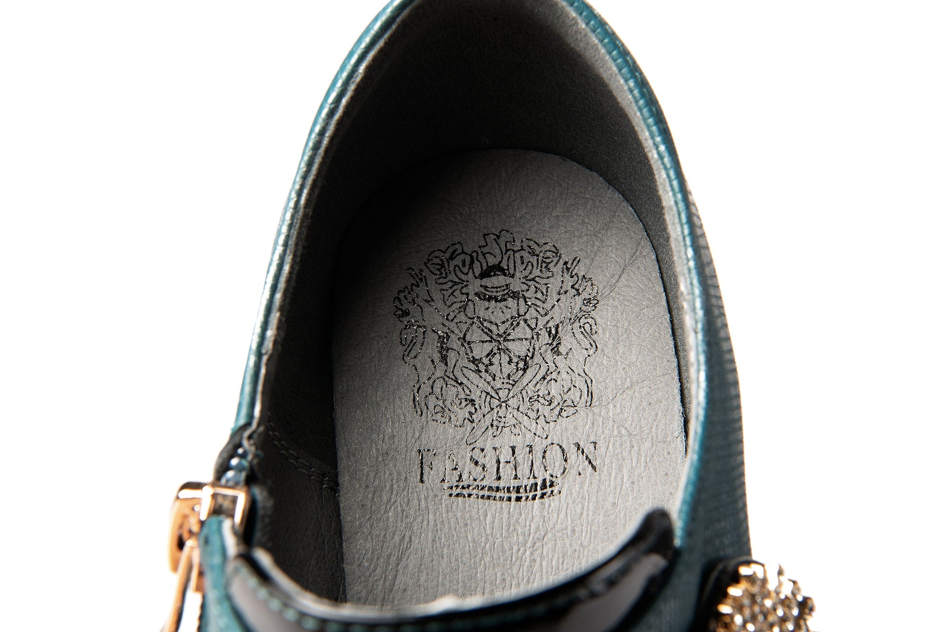 Nine Seven Women's Patent and Genuine Leather Handmade Pointed Toe Spool Heel Green Crystal Side Zip Oxford Pumps
