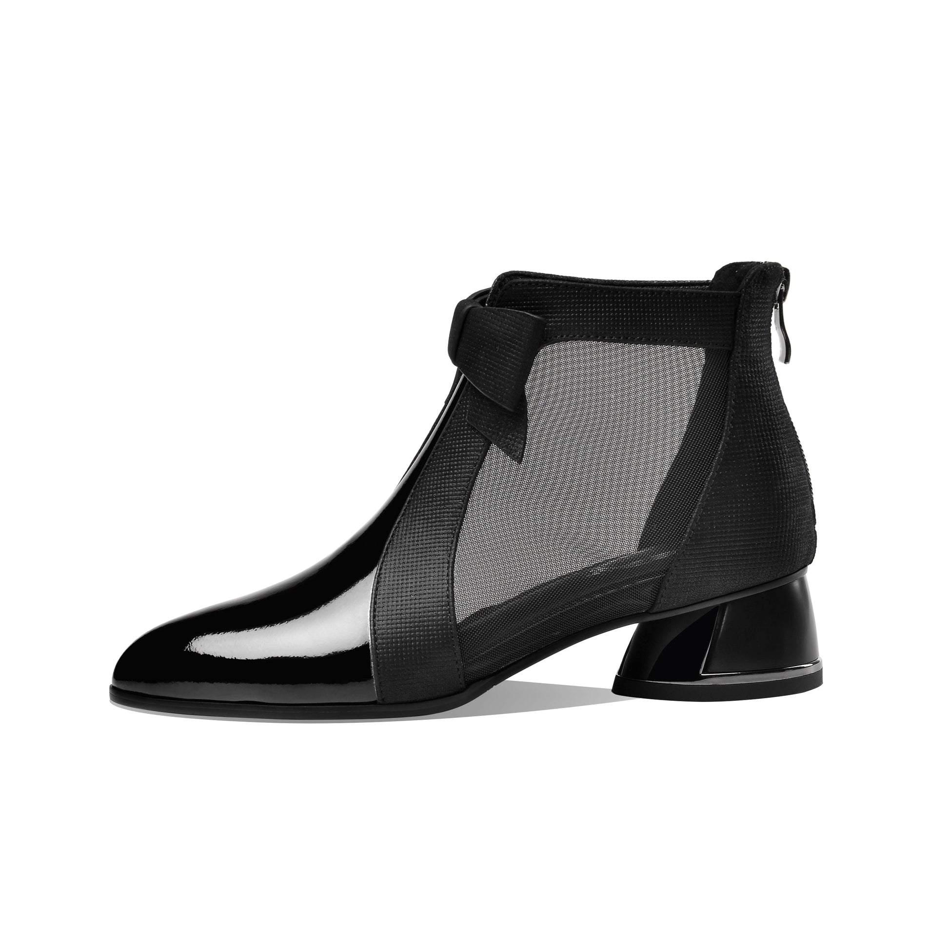 Stylish ankle boots featured with patent leather, mesh, pointed toe, cute bowtie, low chunky heel and back zipper can make you feel comfortable with every steps.