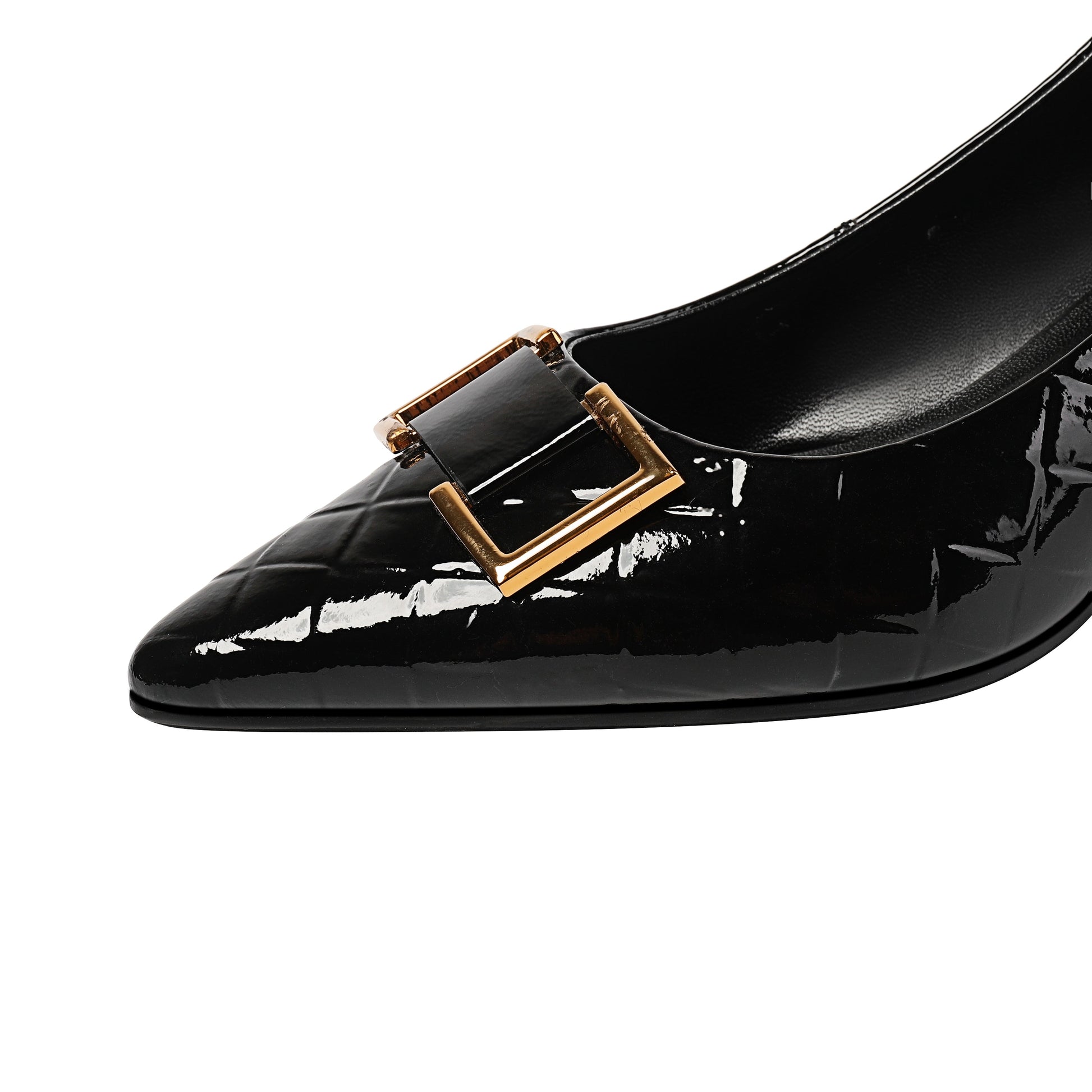 Stylish loafer shoes deisgned with patent leather, pointed toe, buckle and low chunky heels can make you feel comfortable with every steps.