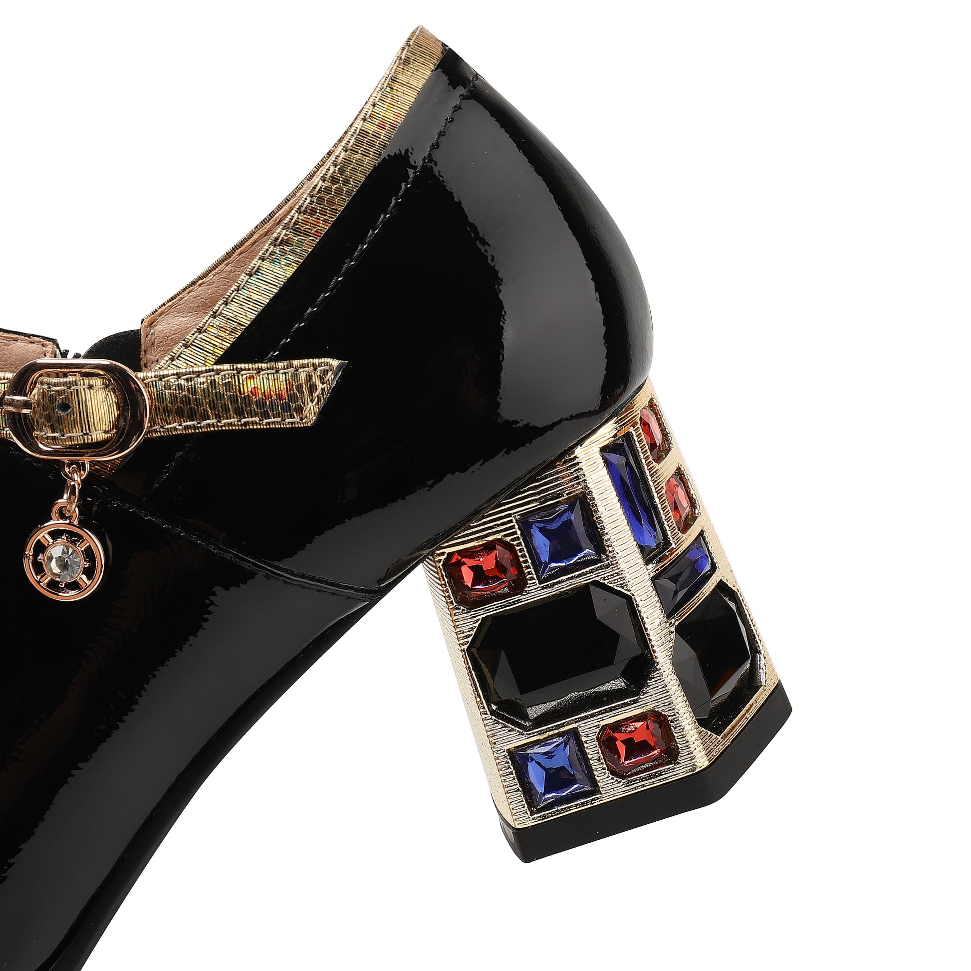 Nine Seven Women's Patent Leather Side Zipper Handmade Mid Chunky Heels with Jewelry Elegant Pumps Shoes